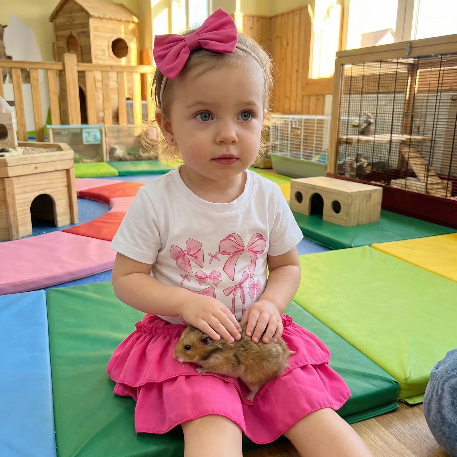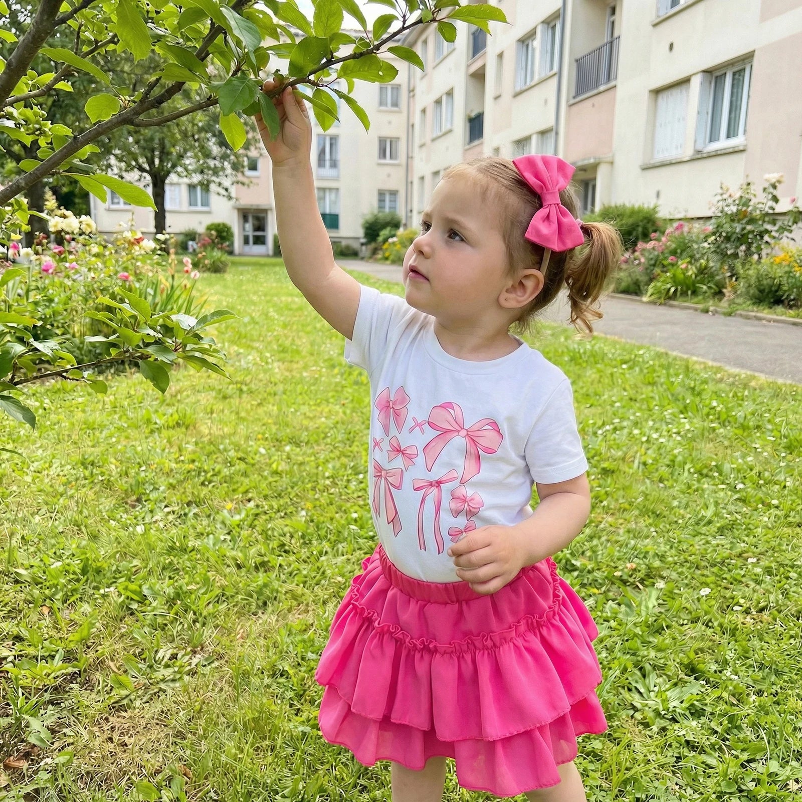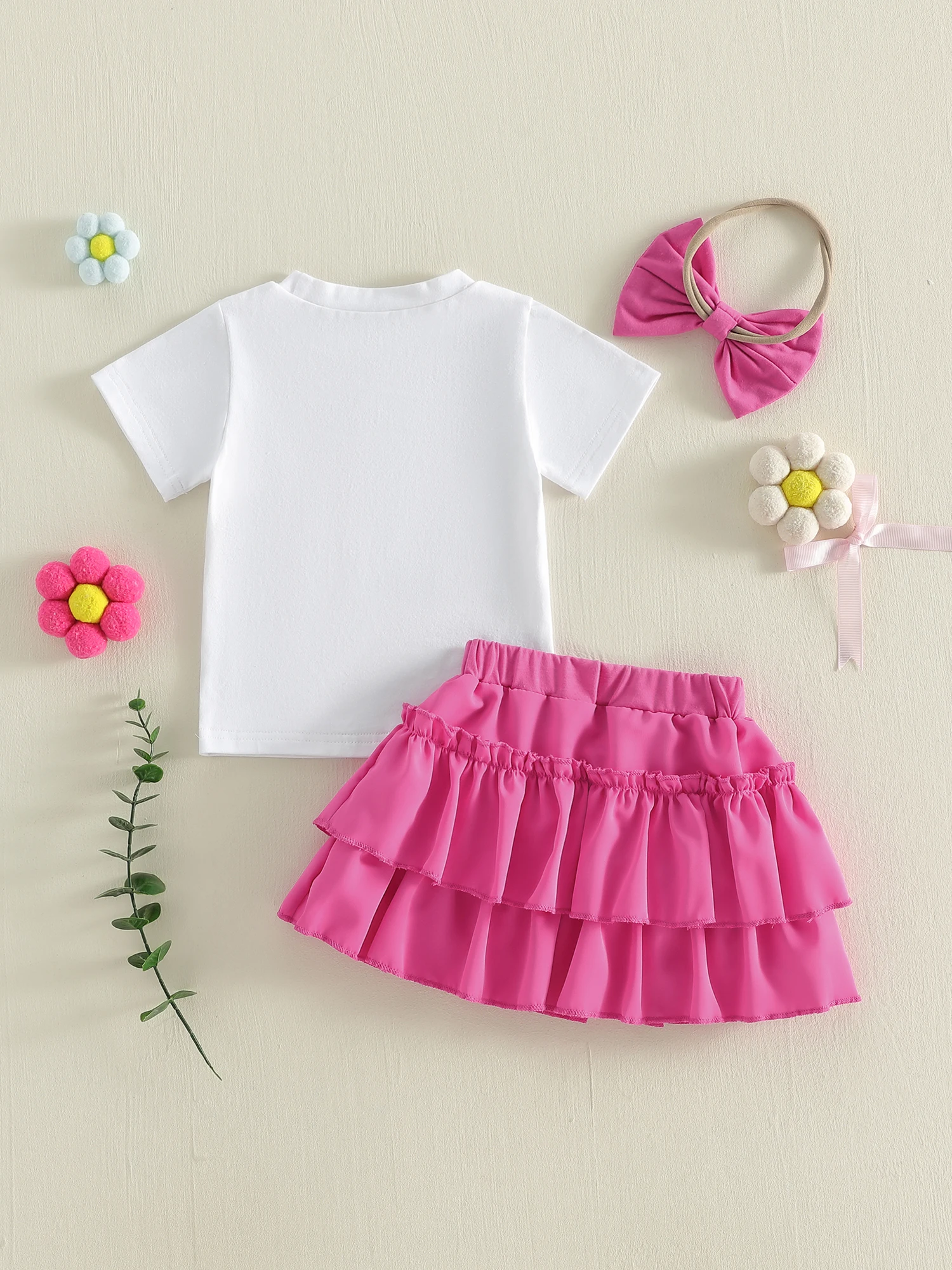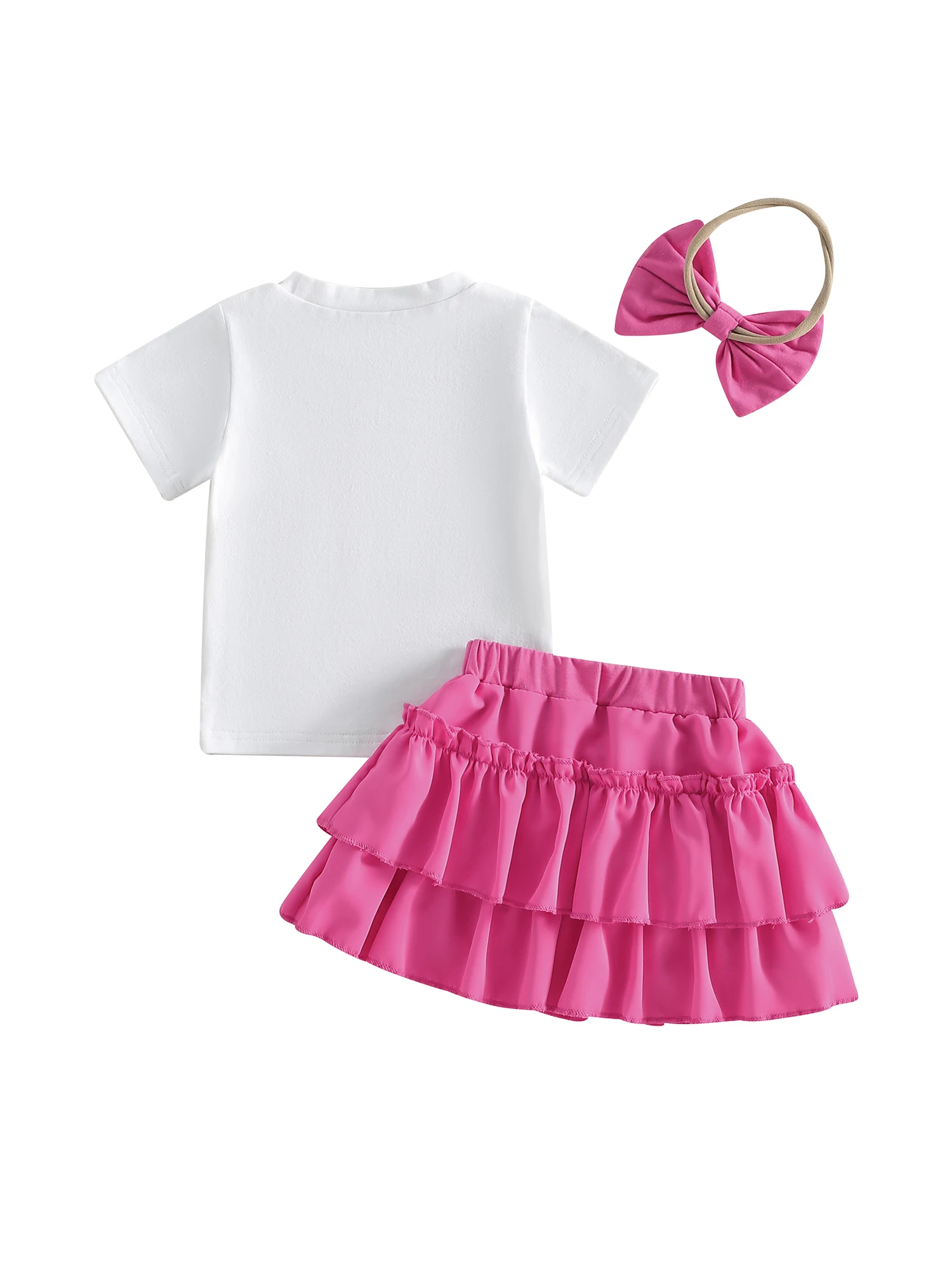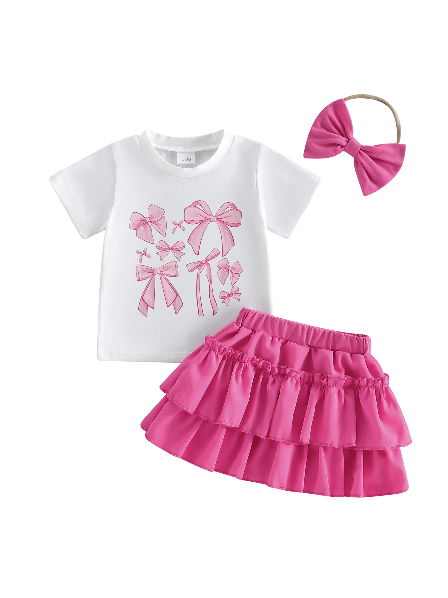 Baby Girl Summer Outfits Bow Print Short Sleeve T-Shirt Riffled Skirt Bow Headband 3 Pcs SetSize(cm)