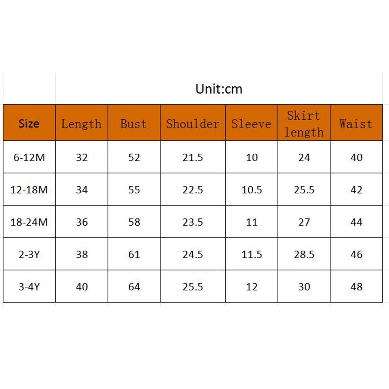 6-12M Tops Length: 32 Bust: 52 Sleeve: 10 Shoulder: 21.5 Skirt Length: 24 Waist: 40 Advised Age: 6-12 Months