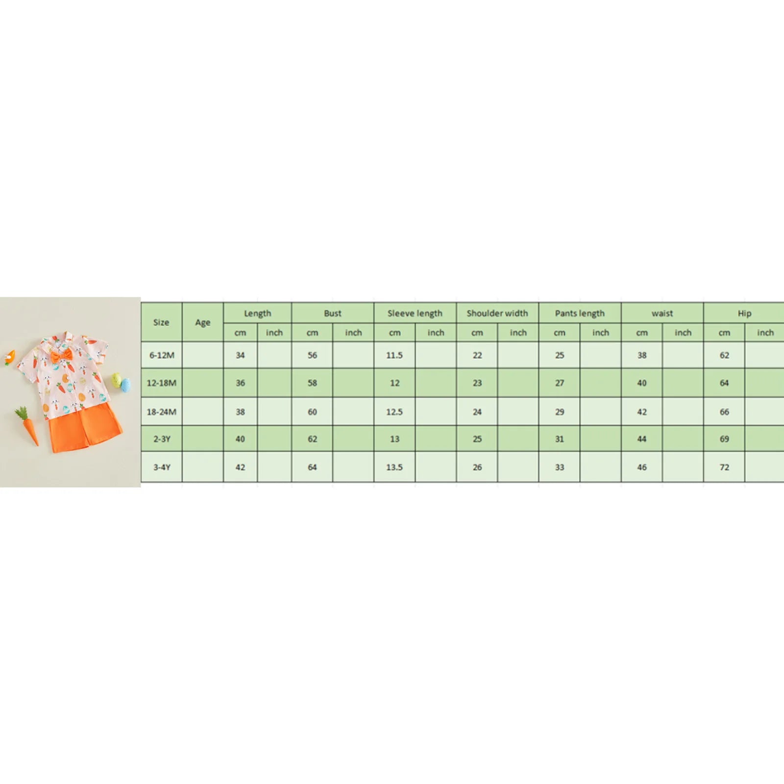 6-12M Clothes Length: 34 Bust: 62 Shoulder: 23 Sleeve Length: 11 Pants Length: 24.5 Hip: 60 Waist: 40 Advised Age: 6-12 Months