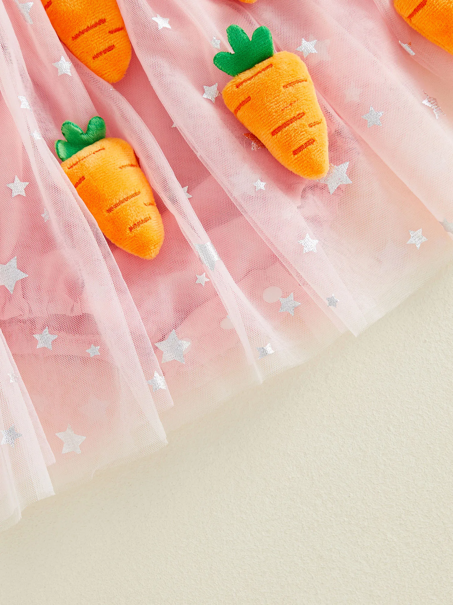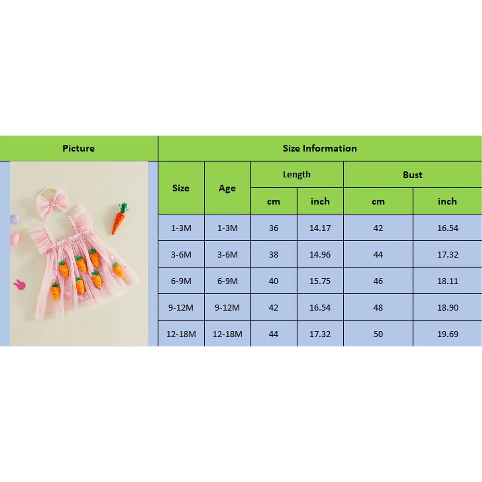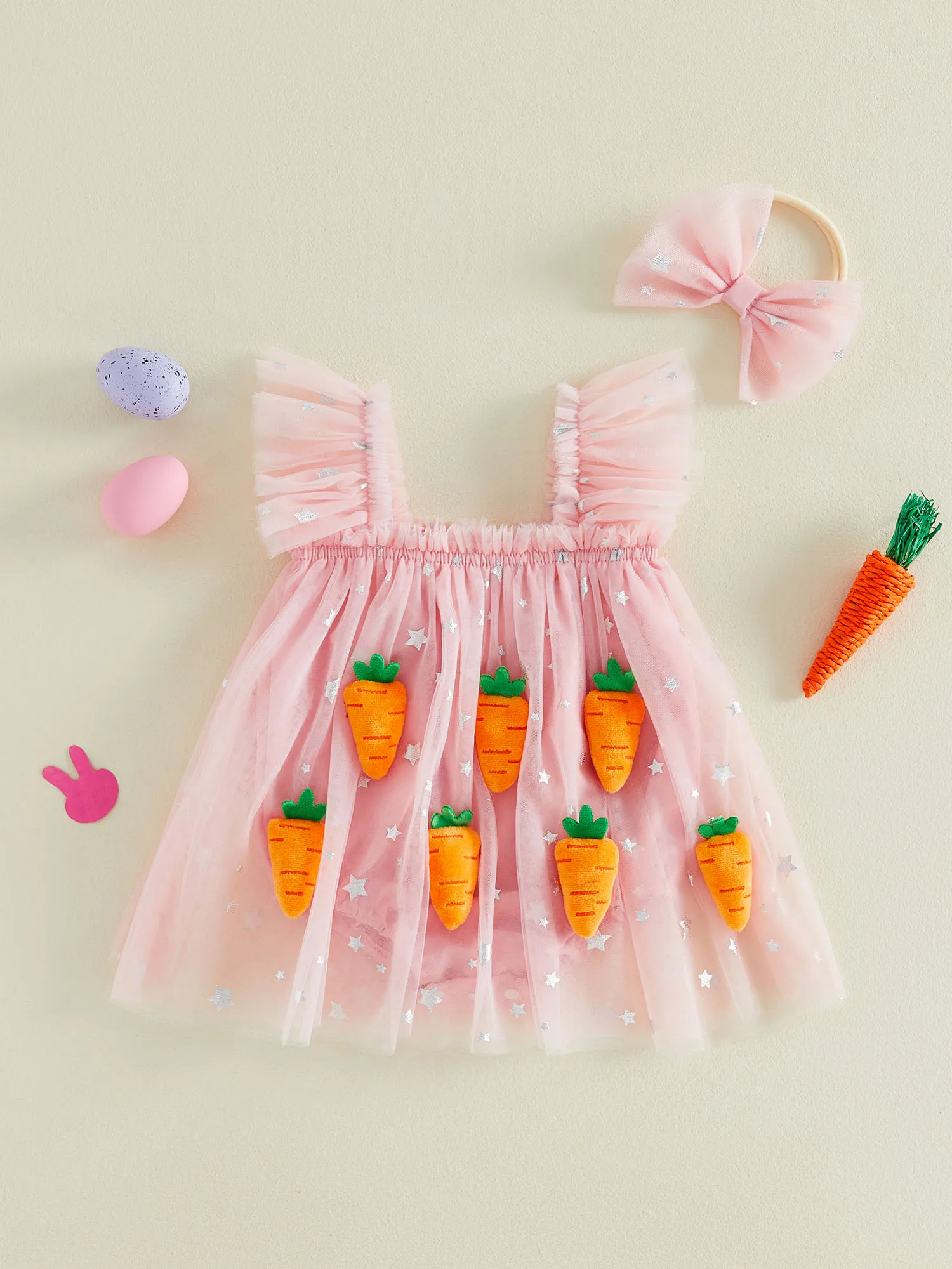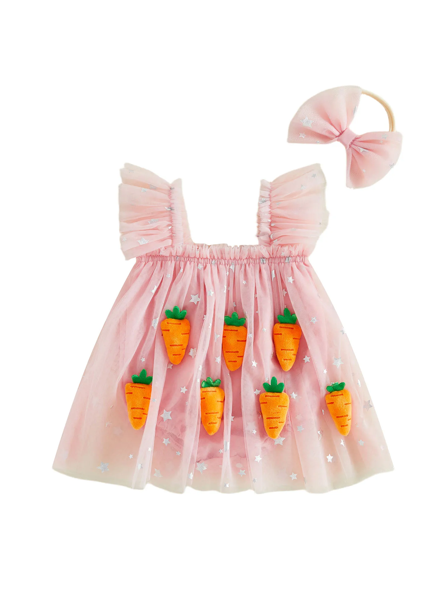 Baby Girls Easter Outfits Carrot Star Pattern Flying Sleeve Mesh Romper Dress with Bow Headband 2 Pcs SetSize (cm):