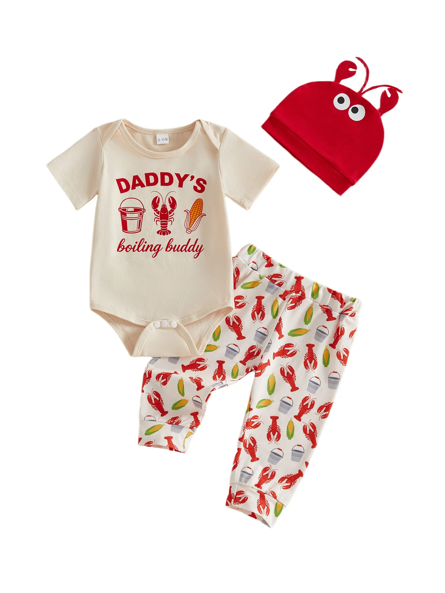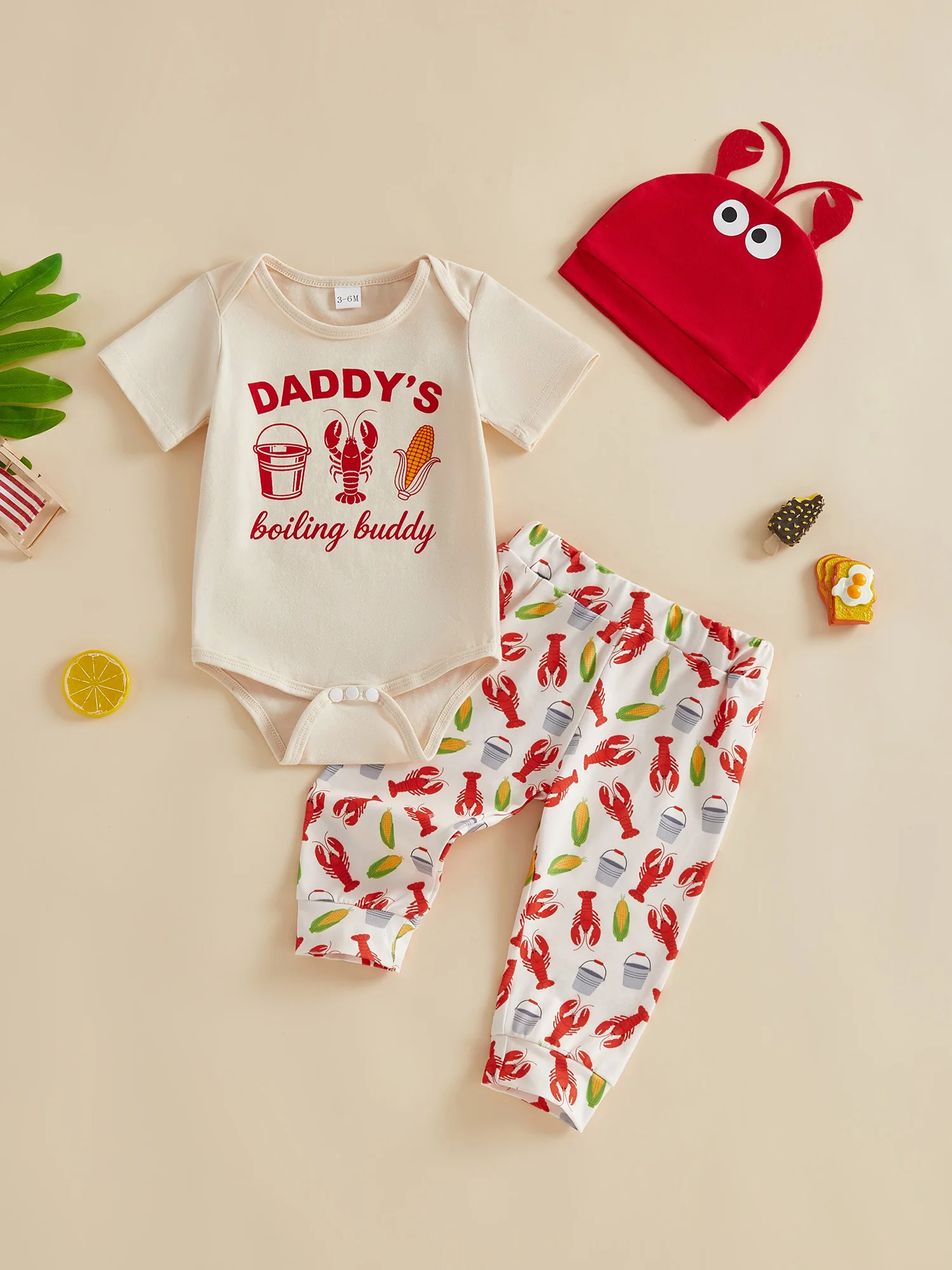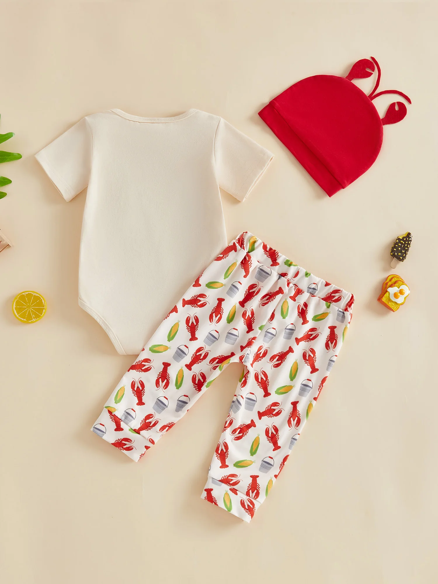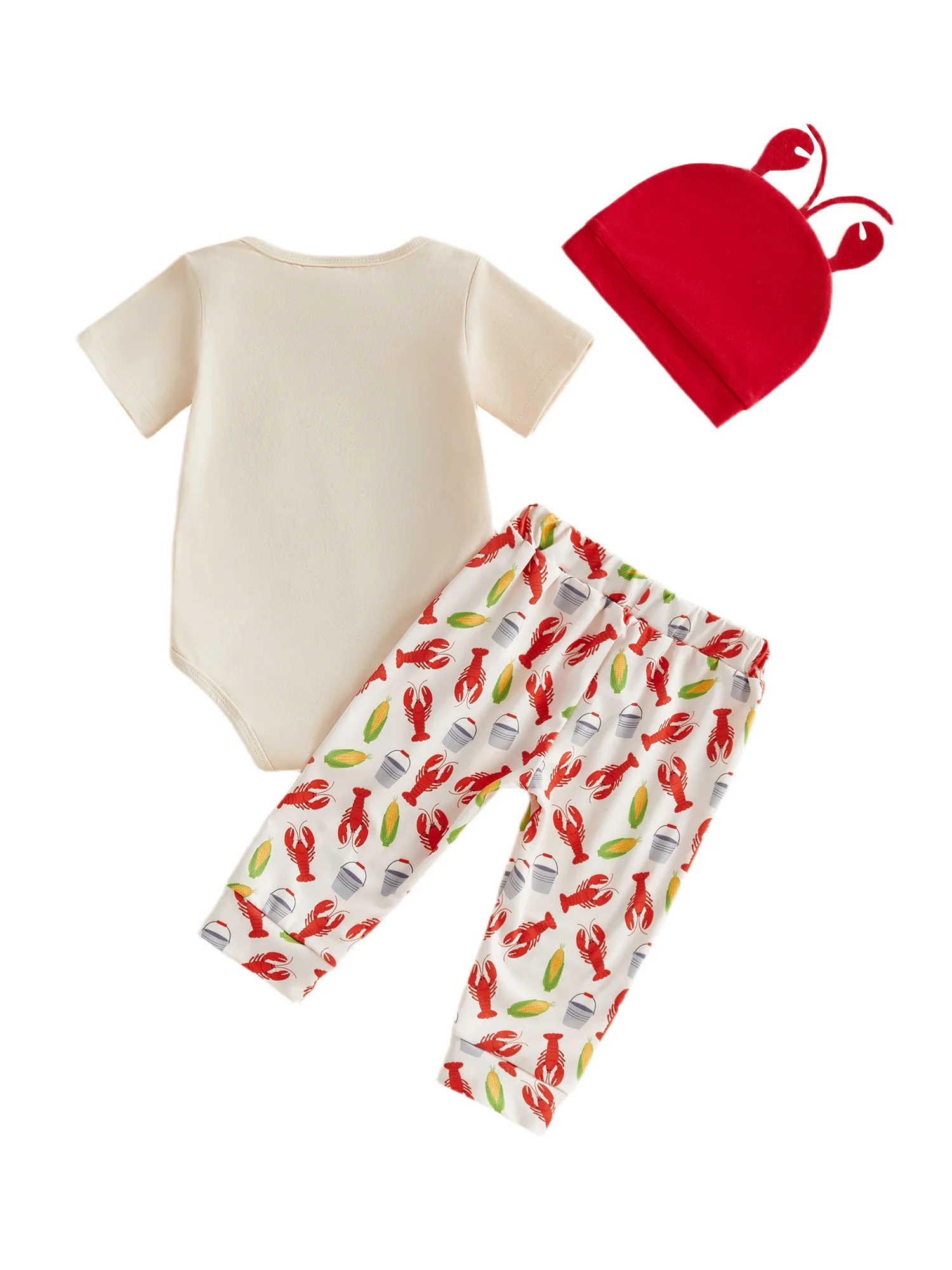 Baby Boys Summer Outfits Letter Lobster Print Round Neck Short Sleeve Rompers Long Pants Hat 3Pcs Clothes SetSize (cm):