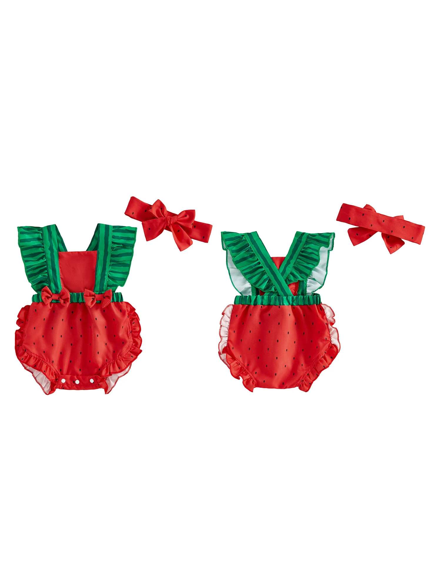 Newborn Girl Outfit, Fly Sleeve Contrast Color Watermelon Romper with Bowknot Hairband Summer ClothesThe cute and fashionable infant baby girl romper with headband outfit must be a wonderful present for your baby. A perfect choice for keeping your little one cool and comfortable during the hot summer months.